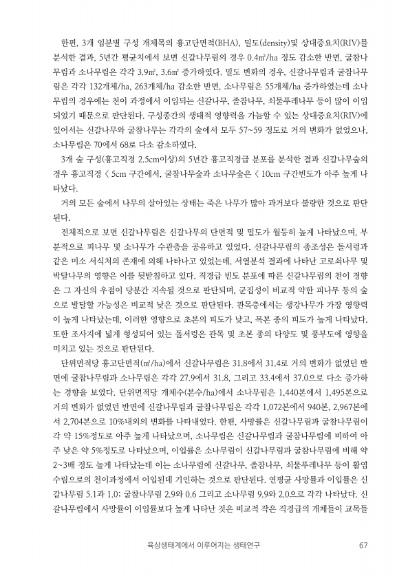 육상생태계에서 이루어지는 생태연구 67 한편, 3개 임분별 구성 개체목의 흉고단면적 BHA , 밀도 density 및 상대중요치 RIV 를 분석한 결과, 5년간 평균치에서 보면 신갈나무림의 경우 0.4㎡/ha 정도 감소한 반면, 굴참나 무림과 소나무림은 각각 3.9㎡, 3.6㎡ 증가하였다. 밀도 변화의 경우, 신갈나무림과 굴참나무 림은 각각 132개체/ha, 263개체/ha 감소한 반면, 소나무림은 55개체/ha 증가하였는데 소나 무림의 경우에는 천이 과정에서 이입되는 신갈나무, 졸참나무, 쇠물푸레나무 등이 많이 이입 되었기 때문으로 판단된다. 구성종간의 생태적 영향력을 가늠할 수 있는 상대중요치 RIV 에 있어서는 신갈나무와 굴참나무는 각각의 숲에서 모두 5759 정도로 거의 변화가 없었으나, 소나무림은 ...