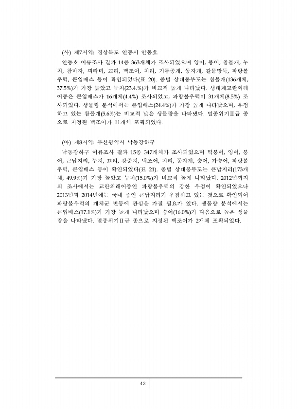 43 사 제7지역경상북도 안동시 안동호 안동호 어류조사 결과 14종 363개체가 조사되었으며 잉어, 붕어, 참몰개, 누 치, 참마자, 피라미, 끄리, 백조어, 치리, 기름종개, 동자개, 갈문망둑, 파랑볼 우럭, 큰입배스 등이 확인되었다 표 20 종별 상대풍부도는 참몰개 136개체, 37.5% 가 가장 높았고 누치 23.4.% 가 비교적 높게 나타났다. 생태계교란외래 어종은 큰입배스가 16개체 4.4% 조사되었고, 파랑볼우럭이 31개체 8.5% 조 사되었다. 생물량 분석에서는 큰입배스 24.4% 가 가장 높게 나타났으며, 우점 하고 있는 참몰개 5.6% 는 비교적 낮은 생물량을 나타냈다. 멸종위기Ⅱ급 종 으로 지정된 백조어가 11개체 포획되었다. 아 제8지역부산광역시 낙동강하구 낙동강하구 어류조사 결과 15종...