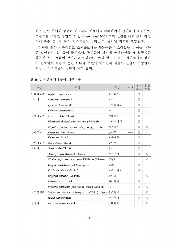 48 과명 학명 국명 피해 현장 조사 문헌 조사 가래나무과 Juglans regia Dode 호두나무 ◎ 가지과 Capsicum annuum L. 고추 ◎ Lycium chinense Mill. 구기자나무 ◎ Solanum melongena L. 가지 ◎ 갈매나무과 Hovenia dulcis Thunb. 헛개나무 ◎ Rhamnella frangulioides Maxim. Weberb. 까마귀베개 ◎ Zizyphus jujuba var. inermis Bunge Rehder 대추나무 ◎ ○ 감나무과 Diospyros kaki Thunb. 감나무 +++ ◎ ○ Diospyros lotus L. 고욤나무 ◎ 감탕나무과 Ilex rotunda Thunb. 먼나무 ◎ 국화과 Aster scaber Thunb. 참취 ...