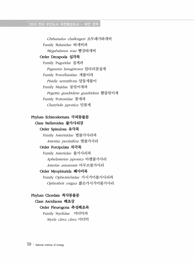 2015 전국 무인도서 자연환경조사 태안 권역 58 ? National Institute of Ecology Chthamalus challengeri 조무래기따개비 Family Balanidae 따개비과 Megabalanus rosa 빨강따개비 Order Decapoda 십각목 Family Paguridat 집게과 Paguurus lanuginosus 털다리참집게 Family Porcellanidae 게붙이과 Pisidia serratifrons 알통게붙이 Family Majidae 물맞이게과 Pegettia guadridens guadridens 뿔물맞이게 Family Portunidae 꽃게과 Charybdis japonica 민꽃게 Phylum Echinodermata 극피동물문 Class Stelle...
