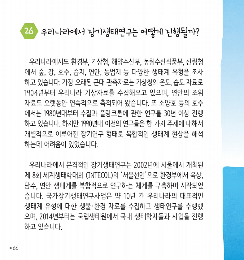 ●66 26 우리나라에서도 환경부, 기상청, 해양수산부, 농림수산식품부, 산림청 에서 숲, 강, 호수, 습지, 연안, 농업지 등 다양한 생태계 유형을 조사 하고 있습니다. 가장 오래된 근대 관측자료는 기상청의 온도, 습도 자료로 1904년부터 우리나라 기상자료를 수집해오고 있으며, 연안의 조위 자료도 오랫동안 연속적으로 측적되어 왔습니다. 또 소양호 등의 호수 에서는 1980년대부터 수질과 플랑크톤에 관한 연구를 30년 이상 진행 하고 있습니다. 하지만 1990년대 이전의 연구들은 한 가지 주제에 대해서 개별적으로 이루어진 장기연구 형태로 복합적인 생태계 현상을 해석 하는데 어려움이 있었습니다. 우리나라에서 본격적인 장기생태연구는 2002년에 서울에서 개최된 제 8회 세계생태학대회 INTECOL 의 ‘서울선...