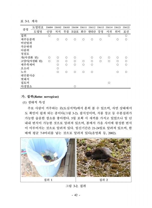 42 종명 도엽번호 336084 336102 336103 336104 336111 336112 336113 336114 336121 336122 도엽명 신양 저지 무릉 모슬포 회수 한라산 강정 서귀 위미 표선 집쥐 ○ ○ ○ 제주등줄쥐 ○ ○ ○ ○ ○ ○ ○ ○ 비단털쥐 작은땃쥐 다람쥐 청설모 개 야생화 된 ○ ○ ○ ○ ○ ○ ○ ○ ○ 고양이 야생화 된 ○ ○ ○ ○ ○ ○ ○ ○ ○ ○ 제주족제비 ○ ○ ○ ○ ○ ○ ○ 오소리 ○ 노루 ○ ○ ○ ○ ○ ○ ○ 대만꽃사슴 멧돼지 집토끼 ○ 야생염소 ○ 표 3-1. 계속 가. 집쥐 Rattus norvegicus 1 생태적 특성 주로 사람이 거주하는 곳 도심지역 에서 흔히 볼 수 있으며, 자연 상태에서 도 확인이 쉽게 되는 종이다 그림 3-2 잡식성이...