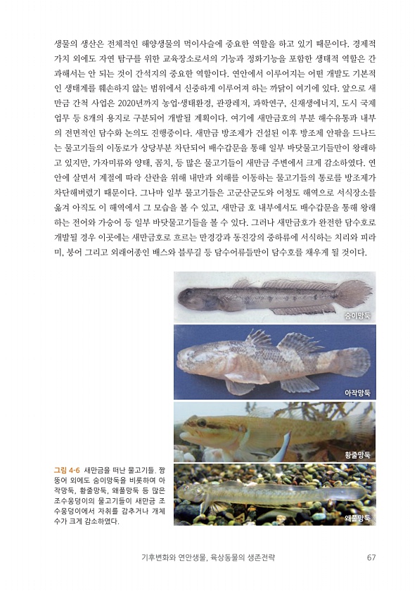기후변화와 연안생물, 육상동물의 생존전략 67 생물의 생산은 전체적인 해양생물의 먹이사슬에 중요한 역할을 하고 있기 때문이다. 경제적 가치 외에도 자연 탐구를 위한 교육장소로서의 기능과 정화기능을 포함한 생태적 역할은 간 과해서는 안 되는 것이 간석지의 중요한 역할이다. 연안에서 이루어지는 어떤 개발도 기본적 인 생태계를 훼손하지 않는 범위에서 신중하게 이루어져 하는 까닭이 여기에 있다. 앞으로 새 만금 간척 사업은 2020년까지 농업·생태환경, 관광레저, 과학연구, 신재생에너지, 도시 국제 업무 등 8개의 용지로 구분되어 개발될 계획이다. 여기에 새만금호의 부분 해수유통과 내부 의 전면적인 담수화 논의도 진행중이다. 새만금 방조제가 건설된 이후 방조제 안팎을 드나드 는 물고기들의 이동로가 상당부분 차단되어...