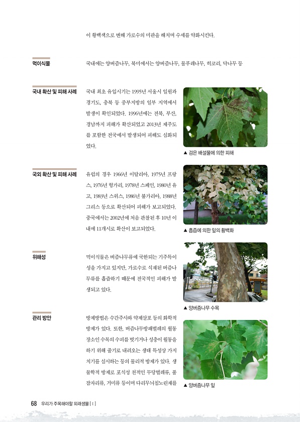 68 우리가 주목해야할 외래생물 [Ⅰ] 이 황백색으로 변해 가로수의 미관을 해치며 수세를 약화시킨다. 먹이식물 국내에는 양버즘나무, 북미에서는 양버즘나무, 물푸레나무, 히코리, 닥나무 등 국내 확산 및 피해 사례 국내 최초 유입시기는 1995년 서울시 일원과 경기도, 충북 등 중부지방의 일부 지역에서 발생이 확인되었다. 1996년에는 전북, 부산, 경남까지 피해가 확산되었고 2013년 제주도 를 포함한 전국에서 발생되어 피해도 심화되 었다. 국외 확산 및 피해 사례 유럽의 경우 1966년 이탈리아, 1975년 프랑 스, 1976년 헝가리, 1978년 스페인, 1980년 유 고, 1983년 스위스, 1986년 불가리아, 1988년 그리스 등으로 확산되어 피해가 보고되었다. 중국에서는 2002년에 처음 관찰된 ...