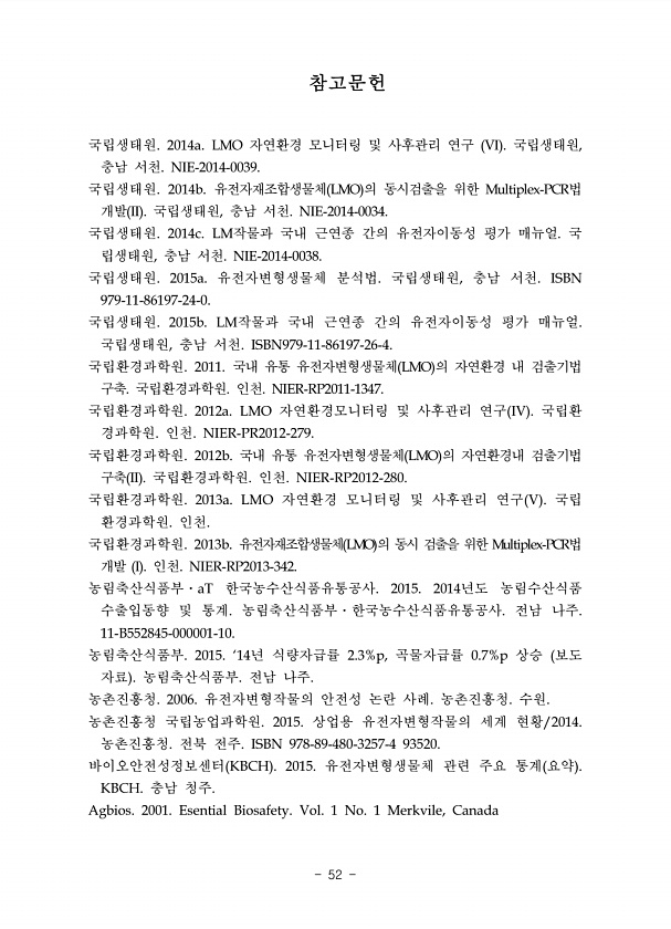 참고문헌 국립생태원. 2014a. LMO 자연환경 모니터링 및 사후관리 연구 VI 국립생태원, 충남 서천. NIE-2014-0039. 국립생태원. 2014b. 유전자재조합생물체 LMO 의 동시검출을 위한 Multiplex-PCR법 개발 II 국립생태원, 충남 서천. NIE-2014-0034. 국립생태원. 2014c. LM작물과 국내 근연종 간의 유전자이동성 평가 매뉴얼. 국 립생태원, 충남 서천. NIE-2014-0038. 국립생태원. 2015a. 유전자변형생물체 분석법. 국립생태원, 충남 서천. ISBN 979-11-86197-24-0. 국립생태원. 2015b. LM작물과 국내 근연종 간의 유전자이동성 평가 매뉴얼. 국립생태원, 충남 서천. ISBN979-11-86197-26-4. 국립환경과학원. 2011...