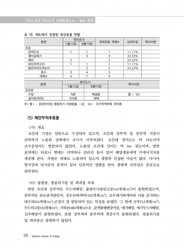2015 전국 무인도서 자연환경조사 완도 권역 58 ? National Institute of Ecology 표 19. 제도에서 관찰된 육상동물 현황 종명 현지조사 최대관찰 개체수 상대우점 특이사항 5월12일 8월19일 조류 깝작도요 1 1 1 11.11% 괭이갈매기 3 3 33.33% 제비 2 2 22.22% 바다직박구리 1 1 1 11.11% 붉은머리오목눈이 2 2 22.22% 종수 3 4 5 개체수 4 7 9 종명 현지조사 특이사항 5월12일 8월19일 포유류 수달 식흔 배설물 멸Ⅰ, VU 설치류 쥐과 서식흔 개체 주 멸Ⅰ 환경부지정 멸종위기 야생동물 Ⅰ급 , VU 국가적색목록 취약종 5 해안무척추동물 가 개요 조간대 기질은 암반으로 구성되어...