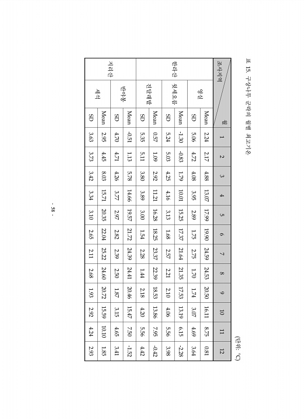 58 월 조사지역 1 2 3 4 5 6 7 8 9 10 11 12 한라산 영실 Mean 2.24 2.17 4.88 13.07 17.99 19.90 24.59 24.53 20.50 16.11 8.75 0.81 SD 5.06 4.72 4.08 3.95 2.89 1.75 2.75 1.70 1.74 3.07 4.69 3.64 윗세오름 Mean -1.30 -0.83 1.79 10.01 15.25 17.37 21.64 21.35 17.53 13.19 6.15 -2.28 SD 5.24 5.03 4.25 4.16 3.13 1.68 2.57 2.21 2.10 4.06 5.56 3.98 진달래밭 Mean 0.57 1.09 2.92 11.21 16.28 18.25 23.37 22.39 18.53 13.86 7.95 -0.42 ...