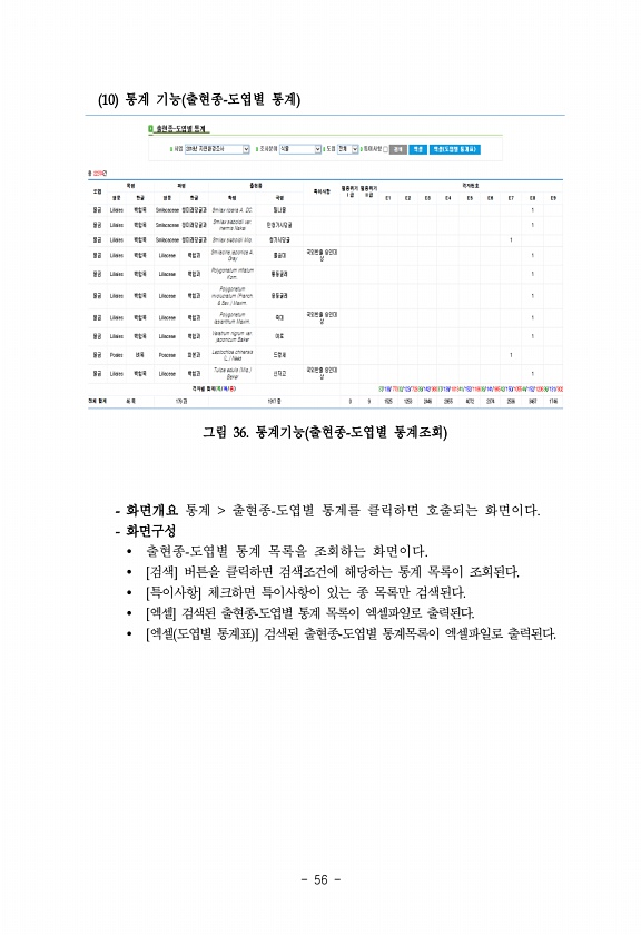 56 10 통계 기능 출현종-도엽별 통계 그림 36. 통계기능 출현종-도엽별 통계조회 화면개요 통계 출현종-도엽별 통계를 클릭하면 호출되는 화면이다. 화면구성 ? 출현종-도엽별 통계 목록을 조회하는 화면이다. ? [검색] 버튼을 클릭하면 검색조건에 해당하는 통계 목록이 조회된다. ? [특이사항] 체크하면 특이사항이 있는 종 목록만 검색된다. ? [엑셀] 검색된 출현종-도엽별 통계 목록이 엑셀파일로 출력된다. ? [엑셀 도엽별 통계표 ] 검색된 출현종-도엽별 통계목록이 엑셀파일로출력된다.