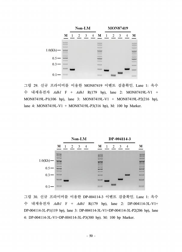 50 그림 29. 신규 프라이머를 이용한 MON87419 이벤트 검출확인. Lane 1옥수 수 내재유전자 Adh1 F + Adh1 R 179 bp , lane 2MON87419L-V1 + MON87419L-P1 106 bp , lane 3MON87419L-V1 + MON87419L-P2 216 bp , lane 4MON87419L-V1 + MON87419L-P3 316 bp , M100 bp Marker. 그림 30. 신규 프라이머를 이용한 DP-004114-3 이벤트 검출확인. Lane 1옥수 수 내재유전자 Adh1 F + Adh1 R 179 bp , lane 2DP-004114-3L-V1+ DP-004114-3L-P1 119 bp , lane 3DP-004114-3L-V1+DP-004114-3L-P2 2...