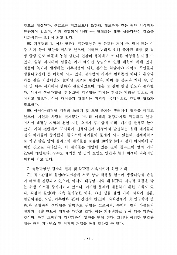 것으로 예상된다. 산호초는 맹그로브나 조간대, 해초층과 같은 해안 서식지와 연관되어 있으며, 이와 결합되어 나타나는 황폐화는 해안 생물다양성 감소를 악화시키는 요인이 되고 있다. B8. 기후변화 및 이와 연관된 극한현상은 종 분포와 개체 수, 번식 또는 이 주 시기 등에 영향을 미치고 있으며, 이러한 변화로 인해 증가된 해충 및 질 병 발생 빈도 때문에 농업 생산과 인간의 행복에도 또 다른 악영향을 미칠 수 있다. 일부 저지대의 섬들은 이미 해수면 상승으로 인한 위협에 처해 있다. 얼음이 녹아서 발생하는 기후작용에 의한 홍수는 히말라야 지역의 주민들과 생물다양성에 큰 위협이 되고 있다. 강수량의 지역적 변화뿐만 아니라 홍수와 가뭄 같은 기상이변도 늘어날 것으로 예상된다. 이미 종 분포와 개체 수, 번 식 및...
