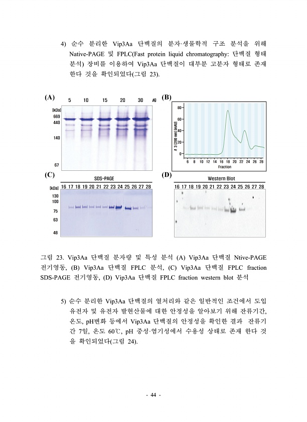 44 4 순수 분리한 Vip3Aa 단백질의 분자·생물학적 구조 분석을 위해 Native-PAGE 및 FPLC Fast protein liquid chromatography단백질 형태 분석 장비를 이용하여 Vip3Aa 단백질이 대부분 고분자 형태로 존재 한다 것을 확인되었다 그림 23 그림 23. Vip3Aa 단백질 분자량 및 특성 분석 A Vip3Aa 단백질 Ntive-PAGE 전기영동, B Vip3Aa 단백질 FPLC 분석, C Vip3Aa 단백질 FPLC fraction SDS-PAGE 전기영동, D Vip3Aa 단백질 FPLC fraction western blot 분석 5 순수 분리한 Vip3Aa 단백질의 열처리와 같은 일반적인 조건에서 도입 유전자 및 유전자 발현산물에 대한 안정성을 알아보기 위해 ...