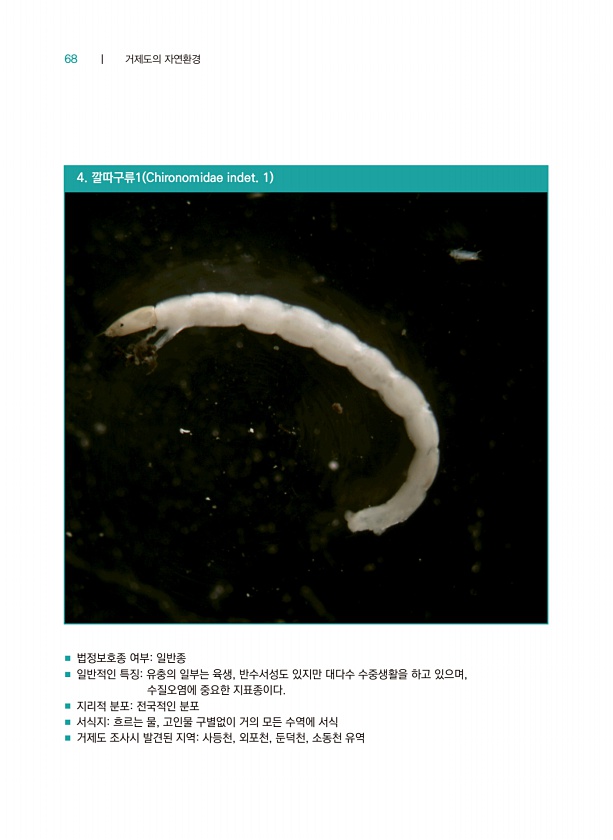 68 ┃ 거제도의 자연환경 4. 깔따구류1 Chironomidae indet. 1 ■ 법정보호종 여부일반종 ■ 일반적인 특징유충의 일부는 육생, 반수서성도 있지만 대다수 수중생활을 하고 있으며, 수질오염에 중요한 지표종이다. ■ 지리적 분포전국적인 분포 ■ 서식지흐르는 물, 고인물 구별없이 거의 모든 수역에 서식 ■ 거제도 조사시 발견된 지역사등천, 외포천, 둔덕천, 소동천유역