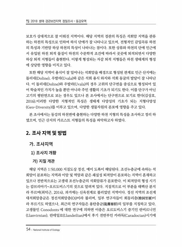 2018 생태·경관보전지역 정밀조사 동강유역 54 ? National Institute of Ecology 보호가 상대적으로 잘 이뤄진 지역이다. 해당 지역의 경관의 특징은 석회암 지역을 관류 하는 하천의 특성으로 인하여 하식 단애가 잘 나타나고 있으며, 전형적인 감입곡류 하천 의 특성과 기반암 하상 하천의 특성이 나타나는 점이다. 또한 상류와 하천의 단애 인근에 서 유입된 하천 퇴적 물질이 하천의 수문학적 조건에 따라서 곳곳에 퇴적되면서 다양한 하상 퇴적 지형들이 출현한다. 이렇게 형성되는 자갈 퇴적 지형들은 하천 생태계의 형성 에 상당한 영향을 미치고 있다. 또한 해당 지역이 용식이 잘 일어나는 석회암을 배경으로 형성된 관계로 인근 산지에는 돌리네 Doline , 우발라 Uvala 와 같은 석회 용식 와...