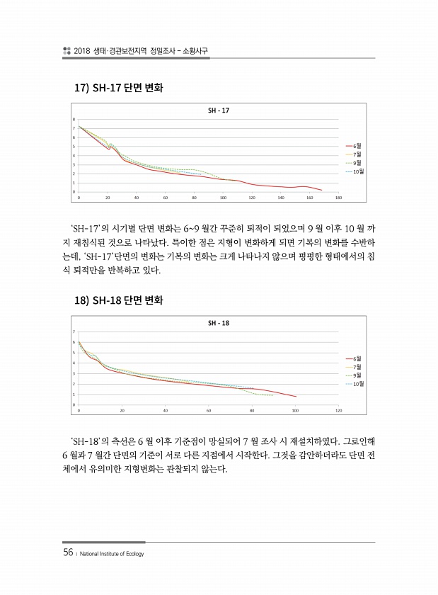 2018 생태·경관보전지역 정밀조사 소황사구 56 ? National Institute of Ecology 17 SH-17 ‘SH-17’의 시기별 단면 변화는 69 월간 꾸준히 퇴적이 되었으며 9 월 이후 10 월 까 지 재침식된 것으로 나타났다. 특이한 점은 지형이 변화하게 되면 기복의 변화를 수반하 는데, ‘SH-17’단면의 변화는 기복의 변화는 크게 나타나지 않으며 평평한 형태에서의 침 식 퇴적만을 반복하고 있다. 18 SH-18 ‘SH-18’의 측선은 6 월 이후 기준점이 망실되어 7 월 조사 시 재설치하였다. 그로인해 6 월과 7 월간 단면의 기준이 서로 다른 지점에서 시작한다. 그것을 감안하더라도 단면 전 체에서 유의미한 지형변화는 관찰되지않는다.