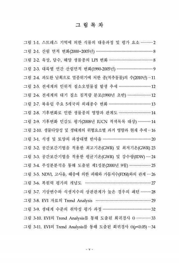 v 그 림 목 차 그림 1-1. 스트레스 기억에 의한 식물의 대응과정 및 평가 요소 ··········· 2 그림 2-1. 산림 면적 변화 20002005년 ·························································8 그림 2-2. 육상, 담수, 해양 생물종의 LPI 변화 ···········································8 그림 2-3. 대륙별 연간 산림면적 변화 1990-2005년 ····································9 그림 2-4. 과도한 남획으로 멸종위기에 처한 종 척추동물 의 수 2010년 ·· 11 그림 2-5. 전세계의 인위적 질소오염물질 발생 추세 ··························...