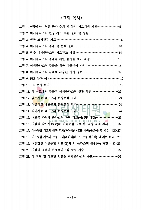 vii 그림 목차 그림 1. 연구대상지역인 금강 수계 및 분석 시료채취 지점 6 그림 2. 미세플라스틱 현장 시료 채취 절차 및 방법 8 그림 3. 현장 조사관련 자료 8 그림 4. 미세플라스틱 추출 및 분석 절차 1* 그림 5. 담수 미세플라스틱 시료건조 과정 14 그림 6. 미세플라스틱 추출을 위한 유기물 제거 과정 15 그림 7. 미세플라스틱 추출을 위한 비중분리 과정 16 그림 8. 미세플라스틱 분석에 사용된 기기 정보 17 그림 9. PES 분광 예시 19 그림 1*. PE 분광 예시 19 그림 11. 각 시료에서 추출된 미세플라스틱 현황 사진 22 그림 12. 담수시료 대조구의 분광분석 결과 23 그림 13. 어류시료 대조구의 분광분석 결과 24 그림 14. 필터시료 대조구의 분광분석 결과 24 ...