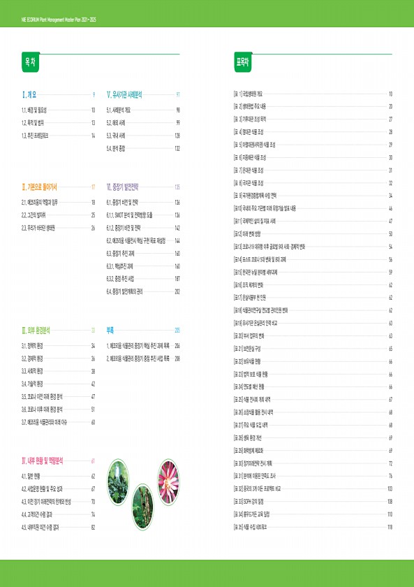 NIE ECORIUM Plant Management Master Plan 2021 2025 목 차 표목차 Ⅳ. 내부 현황 및 역량분석 61 4.1. 일반 현황 62 4.2. 사업운영 현황 및 주요 성과 67 4.3. 이전 장기 미래전략의 한계와 반성 70 4.4. 고객의견 수렴 결과 74 4.5. 내부직원 의견 수렴 결과 82 부록 205 1. 에코리움 식물관리 중장기 핵심 추진 과제 목록 206 2. 에코리움 식물관리 중장기 중점 추진 사업 목록 208 Ⅲ. 외부 환경분석 33 3.1. 정책적 환경 34 3.2. 경제적 환경 36 3.3. 사회적 환경 38 3.4. 기술적 환경 42 3.5. 코로나 이전 미래 환경 분석 47 3.6. 코로나 이후 미래 환경 분석 51 3.7. 에코리움 식물관리와 미래 이슈...