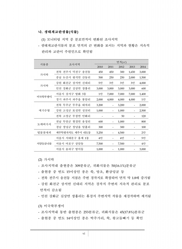 vi 식물종 조사지역 면적 ㎡ 2010 2011 2012 2013 2014 가시박 전북 전주시 덕진구 송천동 450 450 300 1,650 3,000 충남 논산시 광석면 산동리 500 250 250 2,000 1,500 가시박 강원 화천군 상서면 신대리 5만 3만 3만 3만 4,000 인천 강화군 길상면 장흥리 3,000 3,000 3,000 3,000 600 미국쑥부쟁이 서울시 강서구 방화 3동 1만 7,000 7,000 7,000 1,400 경기 파주시 파주읍 봉암리 2,000 4,000 4,000 4,000 1만 애기수영 전북 무주군 무주읍 대차리 3,200 3,200 2,000 강원 고성군 토성면 성천리 1,000 1,000 2,500 전북 고창군 무장면 만화리 50 120 도깨비가지 전남 무안군 ...