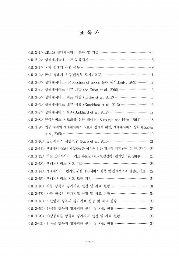 vi 표 목 차 표 2-1 CICES 생태계서비스 분류 및 기능 ·························································4 표 2-2 생태계기능에 따른 분류체계 ····································································5 표 3-1 국외 생태계 유형 분류 ·············································································9 표 3-2 국내 생태계 유형 환경부 토지피복도 ·················································· 11 표 3-3 생태계서비스- Production of goods 분류...