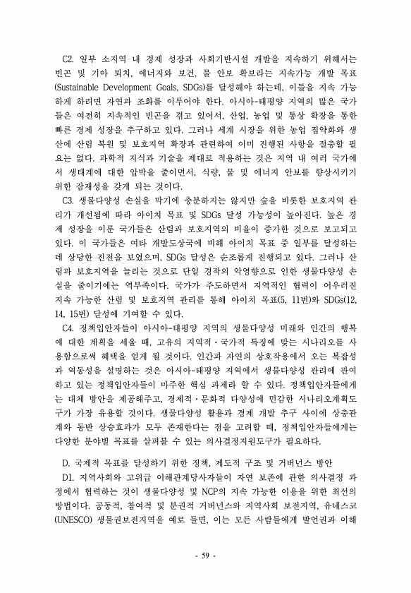 C2. 일부 소지역 내 경제 성장과 사회기반시설 개발을 지속하기 위해서는 빈곤 및 기아 퇴치, 에너지와 보건, 물 안보 확보라는 지속가능 개발 목표 Sustainable Development Goals, SDGs 를 달성해야 하는데, 이들을 지속 가능 하게 하려면 자연과 조화를 이루어야 한다. 아시아-태평양 지역의 많은 국가 들은 여전히 지속적인 빈곤을 겪고 있어서, 산업, 농업 및 통상 확장을 통한 빠른 경제 성장을 추구하고 있다. 그러나 세계 시장을 위한 농업 집약화와 생 산에 산림 복원 및 보호지역 확장과 관련하여 이미 진행된 사항을 절충할 필 요는 없다. 과학적 지식과 기술을 제대로 적용하는 것은 지역 내 여러 국가에 서 생태계에 대한 압박을 줄이면서, 식량, 물 및 에너지 안보를 향상시키기 위한 잠...