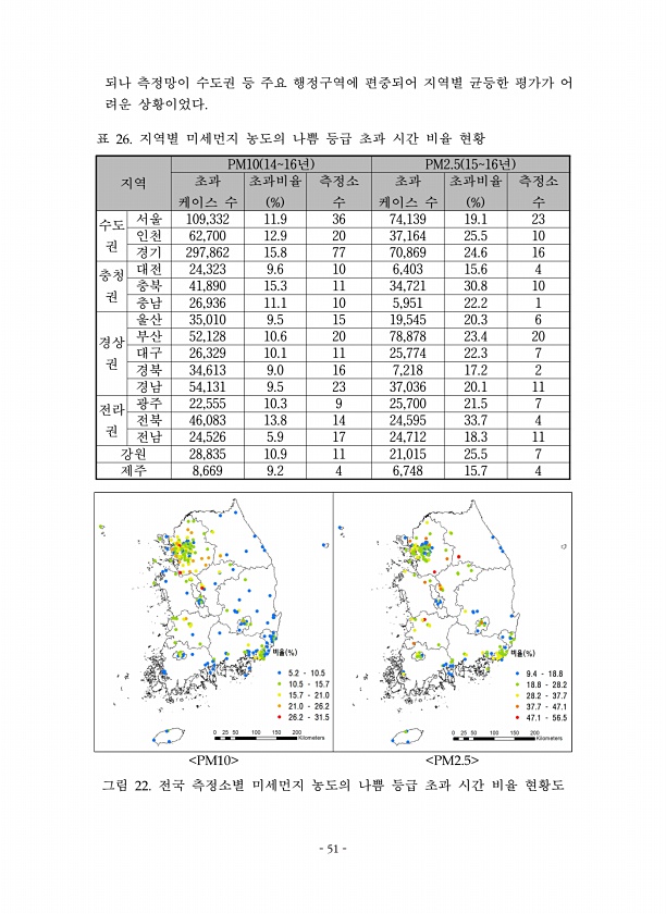 51 되나 측정망이 수도권 등 주요 행정구역에 편중되어 지역별 균등한 평가가 어 려운 상황이었다 지역 PM10 1416년 PM2.5 1516년 초과 케이스 수 초과비율 % 측정소 수 초과 케이스 수 초과비율 % 측정소 수 수도 권 서울 109,332 11.9 36 74,139 19.1 23 인천 62,700 12.9 20 37,164 25.5 10 경기 297,862 15.8 77 70,869 24.6 16 충청 권 대전 24,323 9.6 10 6,403 15.6 4 충북 41,890 15.3 11 34,721 30.8 10 충남 26,936 11.1 10 5,951 22.2 1 경상 권 울산 35,010 9.5 15 19,545 20.3 6 부산 52,128 10.6 20 78,878 23.4 20 대구...