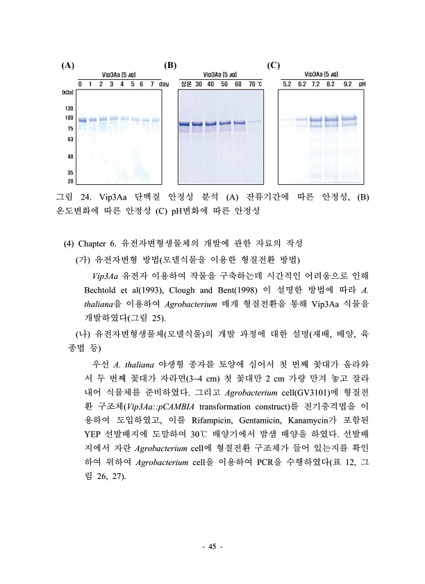 45 그림 24. Vip3Aa 단백질 안정성 분석 A 잔류기간에 따른 안정성, B 온도변화에 따른 안정성 C pH변화에 따른 안정성 4 Chapter 6. 유전자변형생물체의 개발에 관한 자료의 작성 가 유전자변형 방법 모델식물을 이용한 형질전환 방법 Vip3Aa 유전자 이용하여 작물을 구축하는데 시간적인 어려움으로 인해 Bechtold et al 1993 , Clough and Bent 1998 이 설명한 방법에 따라 A. thaliana을 이용하여 Agrobacterium 매개 형질전환을 통해 Vip3Aa 식물을 개발하였다 그림 25 나 유전자변형생물체 모델식물 의 개발 과정에 대한 설명 재배, 배양, 육 종법 등 우선 A. thaliana 야생형 종자를 토양에 심어서 첫 번째 꽃대가 올라와 서 두 번째 ...