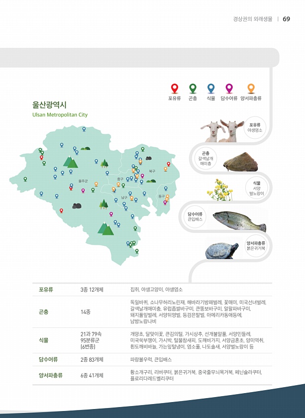 담수어류 큰입배스 울산광역시 Ulsan Metropolitan City 울주군 중구 북구 남구 동구 포유류 3종 12개체 집쥐, 야생고양이, 야생염소 곤충 14종 독일바퀴, 소나무허리노린재, 해바라기방패벌레, 꽃매미, 미국선녀벌레, 갈색날개매미충, 유럽좁쌀바구미, 큰뚱보바구미, 알팔파바구미, 돼지풀잎벌레, 서양뒤영벌, 등검은말벌, 아메리카동애등에, 남방노랑나비 식물 21과 79속 95분류군 6변종 개망초, 달맞이꽃, 큰김의털, 가시상추, 선개불알풀, 서양민들레, 미국쑥부쟁이, 가시박, 털물참새피, 도깨비가지, 서양금혼초, 양미역취, 흰도깨비바늘, 가는잎털냉이, 염소풀, 나도솔새, 서양벌노랑이 등 담수어류 2종 83개체 파랑볼우럭, 큰입배스 양서파충류 6종 41개체 황소개구리, 리버쿠터, 붉은귀거북, 중국줄무...