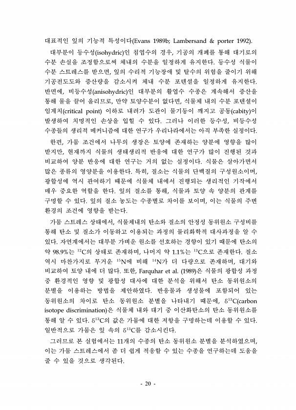 20 대표적인 잎의 기능적 특성이다 Evans 1989b; Lambersand & porter 1992 대부분이 등수성 isohydric 인 침엽수의 경우, 기공의 개폐를 통해 대기로의 수분 손실을 조정함으로써 체내의 수분을 일정하게 유지한다. 등수성 식물이 수분 스트레스를 받으면, 잎의 수리적 기능장애 및 탈수의 위험을 줄이기 위해 기공전도도와 증산량을 감소시켜 체내 수분 포텐셜을 일정하게 유지한다. 반면에, 비등수성 anisohydric 인 대부분의 활엽수 수종은 계속해서 증산을 통해 물을 끌어 올리므로, 만약 토양수분이 없다면, 식물체 내의 수분 포텐셜이 임계치 critical point 이하로 내려가 도관이 물기둥이 깨지고 공동 cabity 이 발생하여 치명적인 손상을 입힐 수 있다. 그러나 이러한 ...
