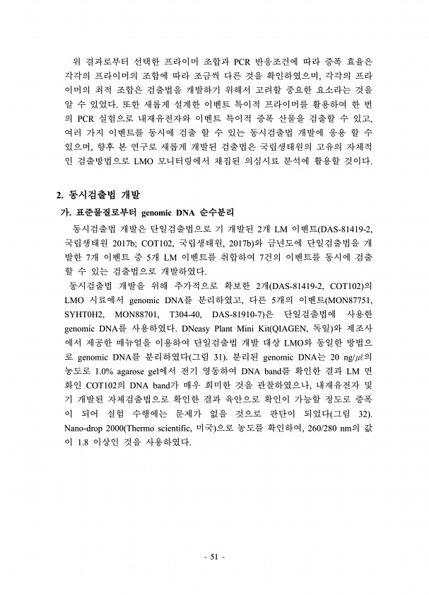 51 위 결과로부터 선택한 프라이머 조합과 PCR 반응조건에 따라 증폭 효율은 각각의 프라이머의 조합에 따라 조금씩 다른 것을 확인하였으며, 각각의 프라 이머의 최적 조합은 검출법을 개발하기 위해서 고려할 중요한 요소라는 것을 알 수 있었다. 또한 새롭게 설계한 이벤트 특이적 프라이머를 활용하여 한 번 의 PCR 실험으로 내재유전자와 이벤트 특이적 증폭 산물을 검출할 수 있고, 여러 가지 이벤트를 동시에 검출 할 수 있는 동시검출법 개발에 응용 할 수 있으며, 향후 본 연구로 새롭게 개발된 검출법은 국립생태원의 고유의 자체적 인 검출방법으로 LMO 모니터링에서 채집된 의심시료 분석에 활용할 것이다. 2. 동시검출법 개발 가. 표준물질로부터 genomic DNA 순수분리 동시검출법 개발은 단일검출법으로 기 개...