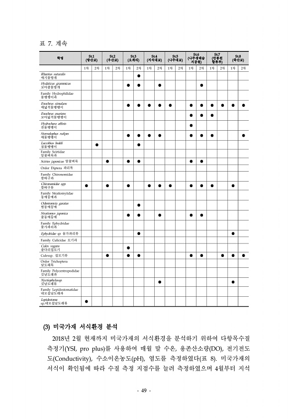 49 학명 St.1 방산교 St.2 우산교 St.3 오계리 St.4 지석대교 St.5 나주대교 St.6 나주생태습 지공원 St.7 만봉천 합류부 St.8 죽산교 1차 2차 1차 2차 1차 2차 1차 2차 1차 2차 1차 2차 1차 2차 1차 2차 Rhantus suturalis 애기물방개 ● Hydaticus grammicus 꼬마줄물방개 ● ● ● ● Family Hydrophilidae 물땡땡이과 Enochrus simulans 애넓적물땡땡이 ● ● ● ● ● ● ● ● ● ● ● Enochrus esuriens 꼬마넓적물땡땡이 ● ● ● Hydrochara affinis 잔물땡땡이 ● Sternolophus rufipes 애물땡땡이 ● ● ● ● ● ● ● ● Laccobius bedeli 점물땡땡이 ...