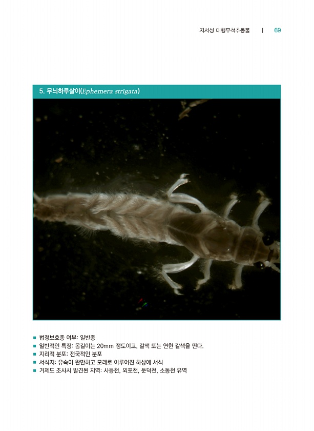 저서성 대형무척추동물 ┃ 69 5. 무늬하루살이 Ephemera strigata ■ 법정보호종 여부일반종 ■ 일반적인 특징몸길이는 20mm 정도이고, 갈색 또는 연한 갈색을 띤다. ■ 지리적 분포전국적인 분포 ■ 서식지유속이 완만하고 모래로 이루어진 하상에 서식 ■ 거제도 조사시 발견된 지역사등천, 외포천, 둔덕천, 소동천유역