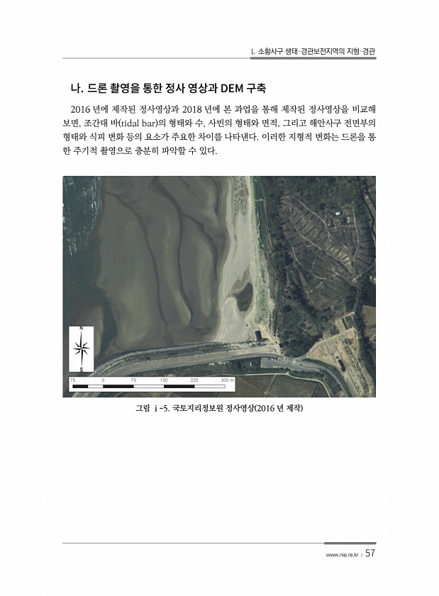 i. 소황사구 생태·경관보전지역의 지형·경관 www.nie.re.kr ? 57 DEM 2016 년에 제작된 정사영상과 2018 년에 본 과업을 통해 제작된 정사영상을 비교해 보면, 조간대 바 tidal bar 의 형태와 수, 사빈의 형태와 면적, 그리고 해안사구 전면부의 형태와 식피 변화 등의 요소가 주요한 차이를 나타낸다. 이러한 지형적 변화는 드론을 통 한 주기적 촬영으로 충분히 파악할 수 있다. 그림 ⅰ-5. 국토지리정보원 정사영상 2016 년 제작