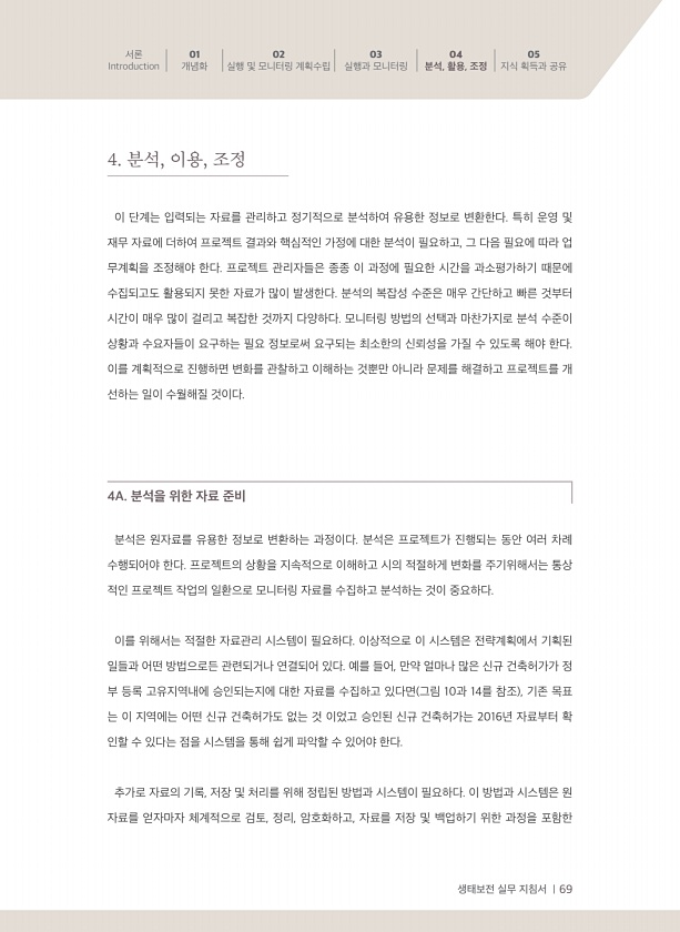 생태보전 실무 지침서 | 69 서론 Introduction 01 개념화 02 실행 및 모니터링 계획수립 03 실행과 모니터링 04 분석, 활용, 조정 05 지식 획득과 공유 이 단계는 입력되는 자료를 관리하고 정기적으로 분석하여 유용한 정보로 변환한다. 특히 운영 및 재무 자료에 더하여 프로젝트 결과와 핵심적인 가정에 대한 분석이 필요하고, 그 다음 필요에 따라 업 무계획을 조정해야 한다. 프로젝트 관리자들은 종종 이 과정에 필요한 시간을 과소평가하기 때문에 수집되고도 활용되지 못한 자료가 많이 발생한다. 분석의 복잡성 수준은 매우 간단하고 빠른 것부터 시간이 매우 많이 걸리고 복잡한 것까지 다양하다. 모니터링 방법의 선택과 마찬가지로 분석 수준이 상황과 수요자들이 요구하는 필요 정보로써 요구되는 최소한의 ...