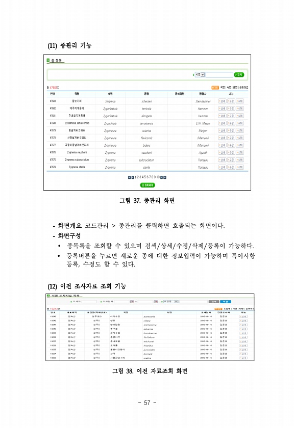 57 11 종관리 기능 그림 37. 종관리 화면 화면개요 코드관리 종관리를 클릭하면 호출되는 화면이다. 화면구성 ? 종목록을 조회할 수 있으며 검색/상세/수정/삭제/등록이 가능하다. ? 등록버튼을 누르면 새로운 종에 대한 정보입력이 가능하며 특이사항 등록, 수정도 할 수 있다. 11 이전 조사자료 조회 기능 그림 34. 이전 자료조회화면