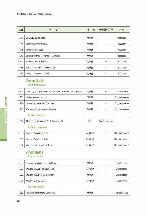 68 번호 학 명 장 소 국가생물종목록 APG 피자식물문 Magnoliophyta Plants List of National Institute Ecology Ⅰ 1243 Veitchia arecina Becc. 열대관 Arecaceae 1244 Veitchia joannis H.Wendl. 열대관 Arecaceae 1245 Veitchia metiti Becc. 열대관 Arecaceae 1246 Veitchia vitiensis H.Wendl. H.E.Moore 열대관 Arecaceae 1247 Veitchia winin H.E.Moore 열대관 Arecaceae 1248 Verschaffeltia splendida H.Wendl. 열대관 Arecaceae 1249 Wodyetia bifurcata A.K....