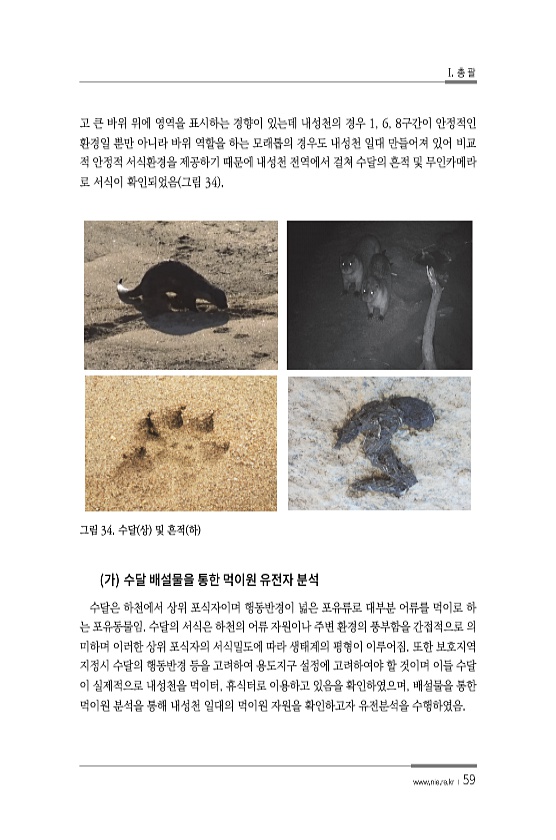 I. 총 괄 www.nie.re.kr ? 59 고 큰 바위 위에 영역을 표시하는 경향이 있는데 내성천의 경우 1, 6, 8구간이 안정적인 환경일 뿐만 아니라 바위 역할을 하는 모래톱의 경우도 내성천 일대 만들어져 있어 비교 적 안정적 서식환경을 제공하기 때문에 내성천 전역에서 걸쳐 수달의 흔적 및 무인카메라 로 서식이 확인되었음 그림 34 그림 34. 수달 상 및 흔적 하 수달은 하천에서 상위 포식자이며 행동반경이 넓은 포유류로 대부분 어류를 먹이로 하 는 포유동물임. 수달의 서식은 하천의 어류 자원이나 주변 환경의 풍부함을 간접적으로 의 미하며 이러한 상위 포식자의 서식밀도에 따라 생태계의 평형이 이루어짐. 또한 보호지역 지정시 수달의 행동반경 등을 고려하여 용도지구 설정에 고려하여야 할 것이며 이들 수달...