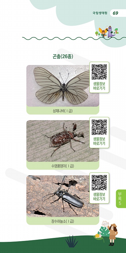 69 곤충 26종 상제나비 Ⅰ급 수염풍뎅이 Ⅰ급 장수하늘소 Ⅰ급 생물정보 바로가기 생물정보 바로가기 생물정보 바로가기 부 록5