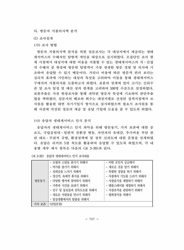 707 방문동기 모험과 스릴을 즐기기 위해서 여가를 즐기기 위해서 성취감을 느끼기 위해서 정신적, 육체적 휴식을 위해서 다양한 행사에 참여하기 위해서 가족과 시간을 보내기 위해서 친구 및 동료들과 친목도모를 위해서 새로운 사람들을 만나기 위해서 일상생활에서의 탈출을 위해서 어떤 곳인지 궁금해서 새로운 것을 알기 위해서 특별한 경험을 하기 위해서 사찰에서 기도를 드리기 위해서 사찰음식을 체험하기 위해서 템플스테이를 체험하기 위해서 사찰유적을 관람하기 위해서 법회참석을 위해서 가치 보존 단일문항 표 3-30 응답자 생태계서비스 인식 조사내용 다. 방문자 지불의사액 분석 1 조사설계 가 조사 방법 방문자 지불의사액 분석을 위한 설문조사는 각 대상지에서 제공되는 생태 계서비스의 수혜자인 탐방객 개인을 대상으로 실시...
