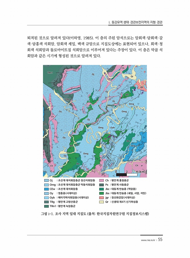 i. 동강유역 생태·경관보전지역의 지형·경관 www.nie.re.kr ? 55 퇴적된 것으로 알려져 있다 이하영, 1985 이 층의 주된 암석으로는 암회색·담회색·갈 색·담홍색 석회암, 암회색 셰일, 백색 규암으로 지질도상에는 표현되어 있으나, 회색·청 회색 석회암과 돌로마이트질 석회암으로 이루어져 있다는 주장이 있다. 이 층은 막골 석 회암과 같은 시기에 형성된 것으로 알려져 있다. 그림 i-1. 조사 지역 일대 지질도 출처한국지질자원연구원 지질정보시스템
