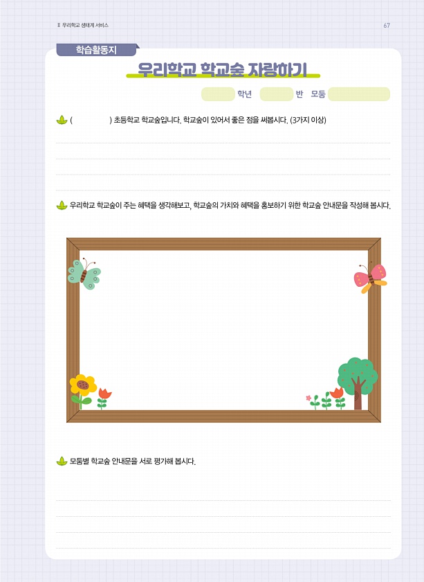 학습활동지 우리학교 학교숲 자랑하기 학년 반 모둠 초등학교 학교숲입니다. 학교숲이 있어서 좋은 점을 써봅시다. 3가지 이상 우리학교 학교숲이 주는 혜택을 생각해보고, 학교숲의 가치와 혜택을 홍보하기 위한 학교숲 안내문을 작성해 봅시다. 모둠별 학교숲 안내문을 서로 평가해 봅시다. Ⅱ 우리학교 생태계 서비스67