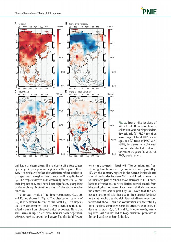 Climate Regulation of Terrestrial Ecosystems https//doi.org/10.22920/PNIE.2020.1.1.58 63 shrinkage of desert areas. This is due to LH effect caused by change in precipitation regimes in the regions. However, it is unclear whether the variations reflect ecological changes over the regions due to very small magnitudes of FCR. The tropics showed high decreasing trends in FCR, but their impacts may no...