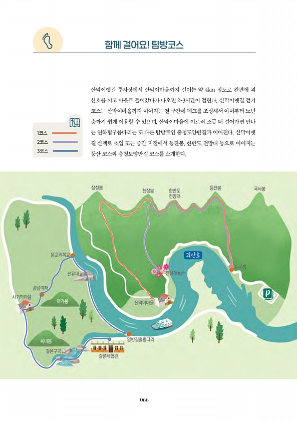 066 함께 걸어요! 탐방코스 산막이옛길 주차장에서 산막이마을까지 길이는 약 4km 정도로 왼편에 괴 산호를 끼고 마을로 들어갔다가 나오면 23시간이 걸린다. 산막이옛길 걷기 코스는 산막이마을까지 이어지는 전 구간에 데크를 조성해서 아이부터 노년 층까지 쉽게 이용할 수 있으며, 산막이마을에 이르러 조금 더 걸어가면 만나 는 연하협구름다리는 또 다른 탐방로인 충청도양반길과 이어진다. 산막이옛 길 산책로 초입 또는 중간 지점에서 등잔봉, 한반도 전망대 등으로 이어지는 등산 코스와 충청도양반길 코스를 소개한다. 1코스 2코스3코스