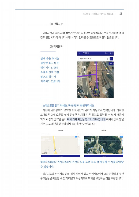 실제 충돌 위치는 십자형 표시가 뜬 위치이지만 GPS 오류로 인해 건물 앞으로 위치가 기록되어있습니다. 4 관찰시각 대표사진에 날짜/시각 정보가 있으면 자동으로 입력됩니다. 수정한 사진을 올릴 경우 촬영 시각이 아니라 수정 시각이 입력될 수 있으므로 확인이 필요합니다. 5 위치등록 스마트폰을 믿지 마세요. 꼭 한 번 더 확인해주세요 사진에 위치정보가 있으면 대표사진의 위치가 자동으로 입력됩니다. 하지만 스마트폰 GPS 오류로 실제 관찰한 위치와 다른 위치로 입력될 수 있기 때문에 ‘지도로 검색 입력’을 눌러 위치 기록 확인을 반드시 해야 합니다. 위치가 맞지 않을 경우, 지도 화면을 움직여 미세 조정을 할 수 있습니다. 일반지도와 위성지도 간의 위치 차이가 있고 위성지도에서 보다 정확하게 주변 구조물들을 확...
