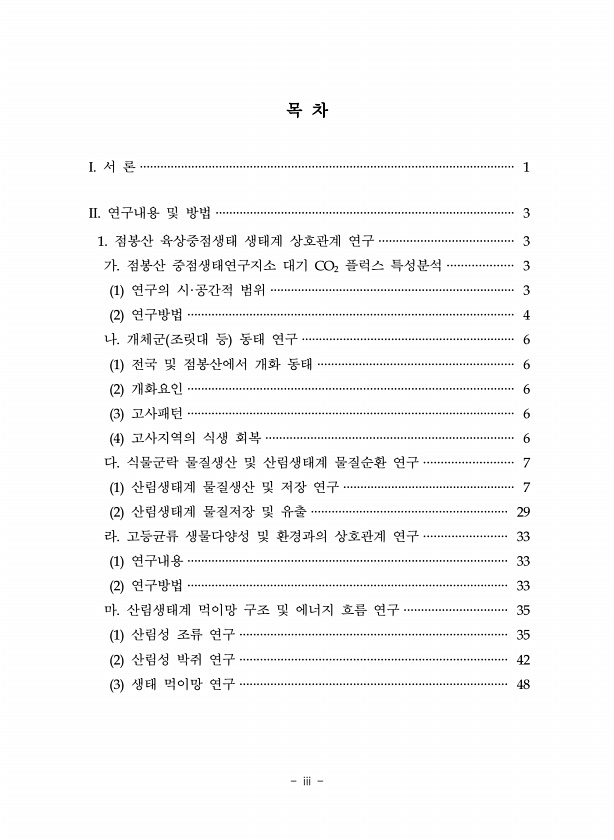 iii 목 차 I. 서 론 ············································································································· 1 II. 연구내용 및 방법 ······················································································· 3 1. 점봉산 육상중점생태 생태계 상호관계 연구 ······································· 3 가. 점봉산 중점생태연구지소 대기 CO2 플럭스 특성분석 ··················· 3 1 연구의 시·공간적 범위 ································...