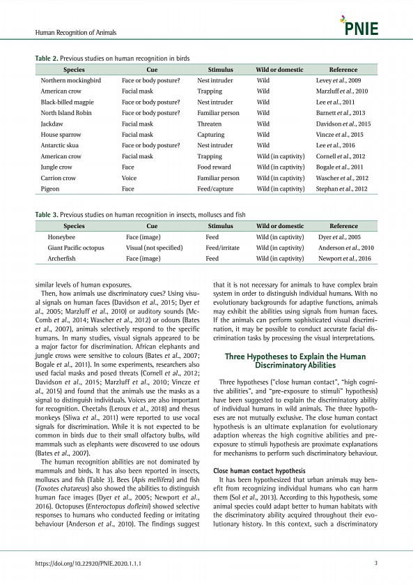 Human Recognition of Animals https//doi.org/10.22920/PNIE.2020.1.1.1 3 similar levels of human exposures. Then, how animals use discriminatory cues? Using visual signals on human faces Davidson et al., 2015; Dyer et al., 2005; Marzluff et al., 2010 or auditory sounds McComb et al., 2014; Wascher et al., 2012 or odours Bates et al., 2007 , animals selectively respond to the specific humans. In many...