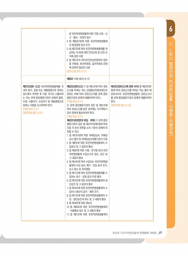 6 환경부 유전자변형생물체 안전관리 가이드 _69 1 L M O 법령단위 비교표 법률- 시행령- 시행규칙 제21조 경유 신고 유전자변형생물체를 국 내의 항구, 공항 또는 대통령령으로 정하는 장소에서 하역한 후 다른 국가로 수출하려 는 자는 관계 중앙행정기관의 장에게 품목, 수량, 수출국가, 수입국가 등 대통령령으로 정하는 사항을 신고하여야 한다. 개정 2012.12.11 [전문개정 2007.12.21] 른 유전자변형생물체 대한 각종 신청ㆍ신 고ㆍ통보ㆍ요청의 접수 4. 법 제26조의2에 따른 유전자변형생물체 의 환경영향 등의 조사 5. 법 제27조에 따라 유전자변형생물체를 취 급하는 자 등에 대한 안전교육 등 안전 조 치에 관한 사항 6. 법 제31조의 바이오안전성위원회의 업무 중 위원회, 분과위원회, 실무위...