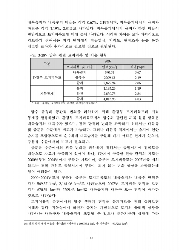 -47- 내륙습지와 내륙수의 비율은 각각 이며 지목통계에서의 유지와 하천은 각각 로 나타났다 지목통계에서의 유지와 하천 비율이 전반적으로 토지피복도에 비해 높게 나타났다 이러한 차이를 보다 과학적으로 검토하기 위해서는 지역 단위에서 항공영상 지적도 현장조사 등을 통한 세밀한 조사가 추가적으로 필요할 것으로 판단된다 구분 토지피복 및 이용 면적 km2 비율 환경부 토지피복도 내륙습지 내륙수 합계 지목통계 유지 하천 합계 * 출처 통계청, 국가통계포털; 환경부, 환경공간정보서비스 표 담수 관련 토지피복 및 이용 현황 담수 유형의 공간적 변화를 파악하기 위해 환경부 토지피복도와 지적 통계를 활용하였다 환경부 토지피복도에서 담수와 관련된 피복 분류 항목은 내륙습지와 내륙수가 있으며 전국 단위의 변화를 파악하기 위해...