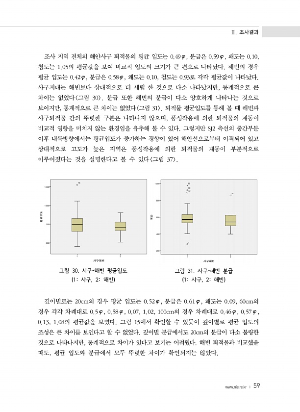 Ⅱ. 조사결과 www.nie.re.kr ? 59 조사 지역 전체의 해안사구 퇴적물의 평균 입도는 0.49φ, 분급은 0.59φ, 왜도는 0.10, 첨도는 1.05의 평균값을 보여 비교적 입도의 크기가 큰 편으로 나타났다. 해빈의 경우 평균 입도는 0.42φ, 분급은 0.58φ, 왜도는 0.10, 첨도는 0.93로 각각 평균값이 나타났다. 사구지대는 해빈보다 상대적으로 더 세립 한 것으로 다소 나타났지만, 통계적으로 큰 차이는 없었다 그림 30 분급 또한 해빈의 분급이 다소 양호하게 나타나는 것으로 보이지만, 통계적으로 큰 차이는 없었다 그림 31 퇴적물 평균입도를 통해 볼 때 해빈과 사구퇴적물 간의 뚜렷한 구분은 나타나지 않으며, 풍성작용에 의한 퇴적물의 재동이 비교적 영향을 미치지 않는 환경임을 유추해 볼...