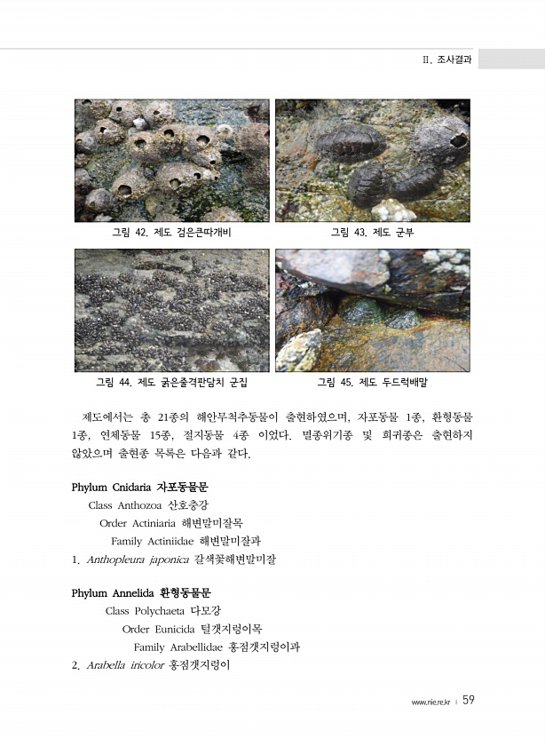 Ⅱ. 조사결과 www.nie.re.kr ? 59 그림 42. 제도 검은큰따개비 그림 43. 제도 군부 그림 44. 제도 굵은줄격판담치 군집 그림 45. 제도 두드럭배말 제도에서는 총 21종의 해안무척추동물이 출현하였으며, 자포동물 1종, 환형동물 1종, 연체동물 15종, 절지동물 4종 이었다. 멸종위기종 및 희귀종은 출현하지 않았으며 출현종 목록은 다음과 같다. Phylum Cnidaria 자포동물문 Class Anthozoa 산호충강 Order Actiniaria 해변말미잘목 Family Actiniidae 해변말미잘과 1. Anthopleura japonica 갈색꽃해변말미잘 Phylum Annelida 환형동물문 Class Polychaeta 다모강 Order Eunicida 털갯지렁이목 Family ...