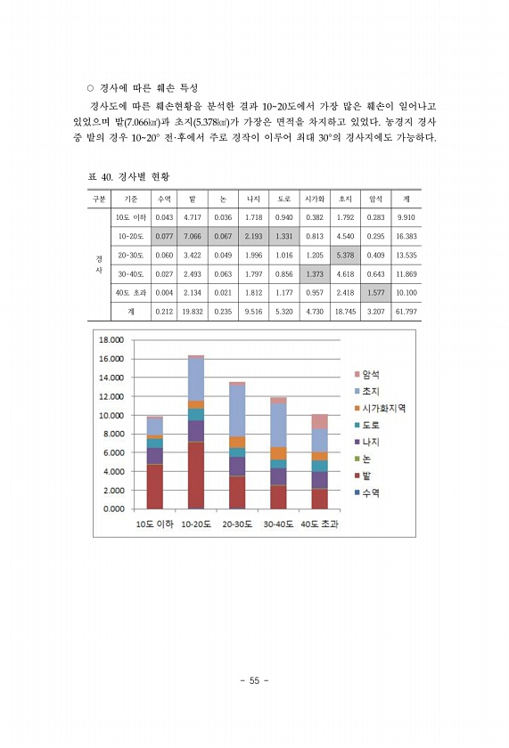 55 ○ 경사에 따른 훼손 특성 경사도에 따른 훼손현황을 분석한 결과 1020도에서 가장 많은 훼손이 일어나고 있었으며 밭 7.066㎢ 과 초지 5.378㎢ 가 가장은 면적을 차지하고 있었다. 농경지 경사 중 밭의 경우 1020° 전·후에서 주로 경작이 이루어 최대 30°의 경사지에도 가능하다. 구분 기준 수역 밭 논 나지 도로 시가화 초지 암석 계 경사 10도 이하 0.043 4.717 0.036 1.718 0.940 0.382 1.792 0.283 9.910 10-20도 0.077 7.066 0.067 2.193 1.331 0.813 4.540 0.295 16.383 20-30도 0.060 3.422 0.049 1.996 1.016 1.205 5.378 0.409 13.535 30-40도 0.027 2....